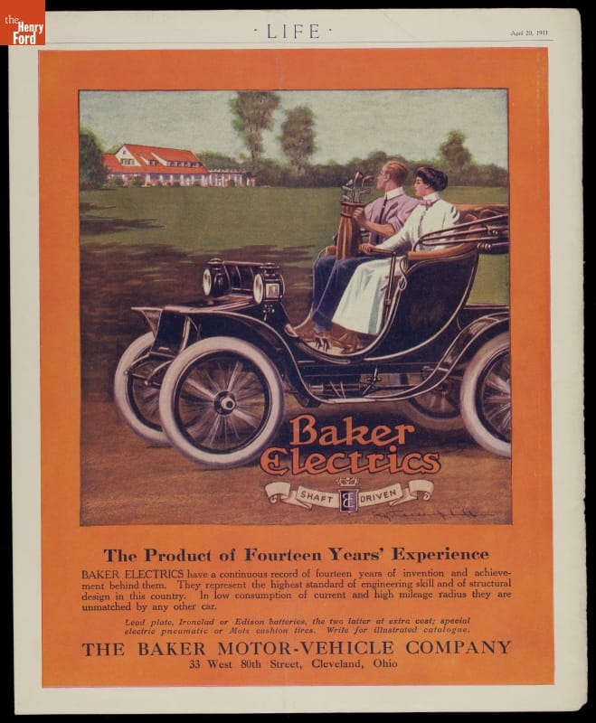This 1911 advertisement praised the Baker Motor Vehicle Company's fourteen years of "invention and achievement" as an electric car manufacturer. Similar ads touted the vehicle's other advantages. Baker electrics were simple to use, reliable, safe, clean, and elegantly styled -- qualities implied by the ad's artwork.