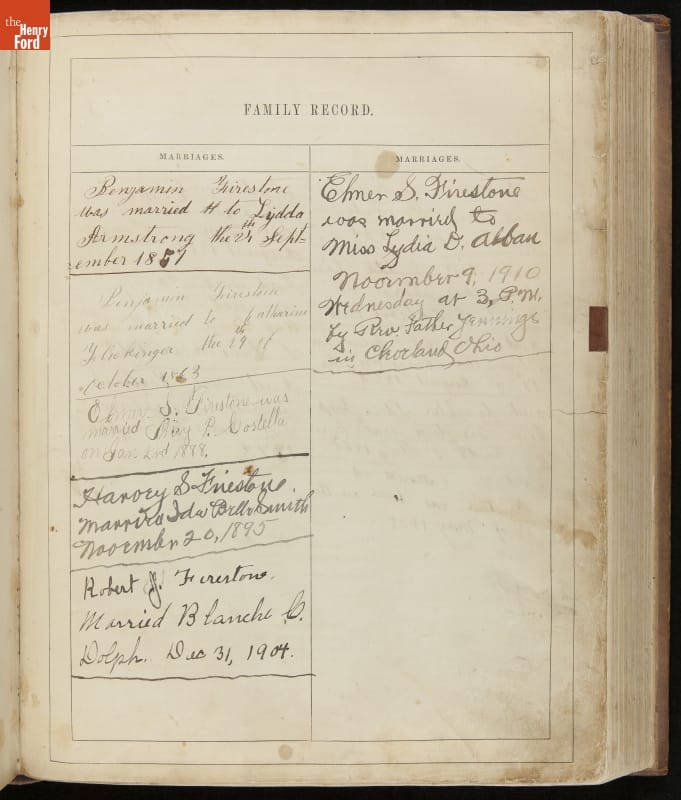 Many 19th-century Americans recorded births, deaths and marriages in family bibles. Mothers, or some other family member, faithfully documented these significant family events on dedicated pages in the bible. Subsequent generations sometimes added and updated entries. This bible belonged to the Firestone family and includes the name of Harvey S. Firestone, the founder of Firestone Tire and Rubber Company.