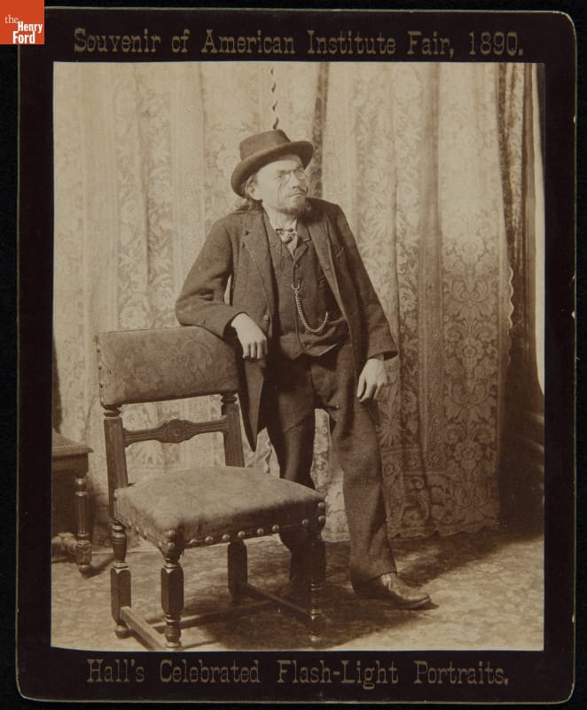 on front, top: Souvenir of American Institute Fair, 1890. on front, bottom: Hall's Celebrated Flash-Light Portraits. on back: JOSEPH HALL, PROP'R. / KENSINGTON ART STUDIO / 349 FULTON STREET BROOKLYN, N.Y.
