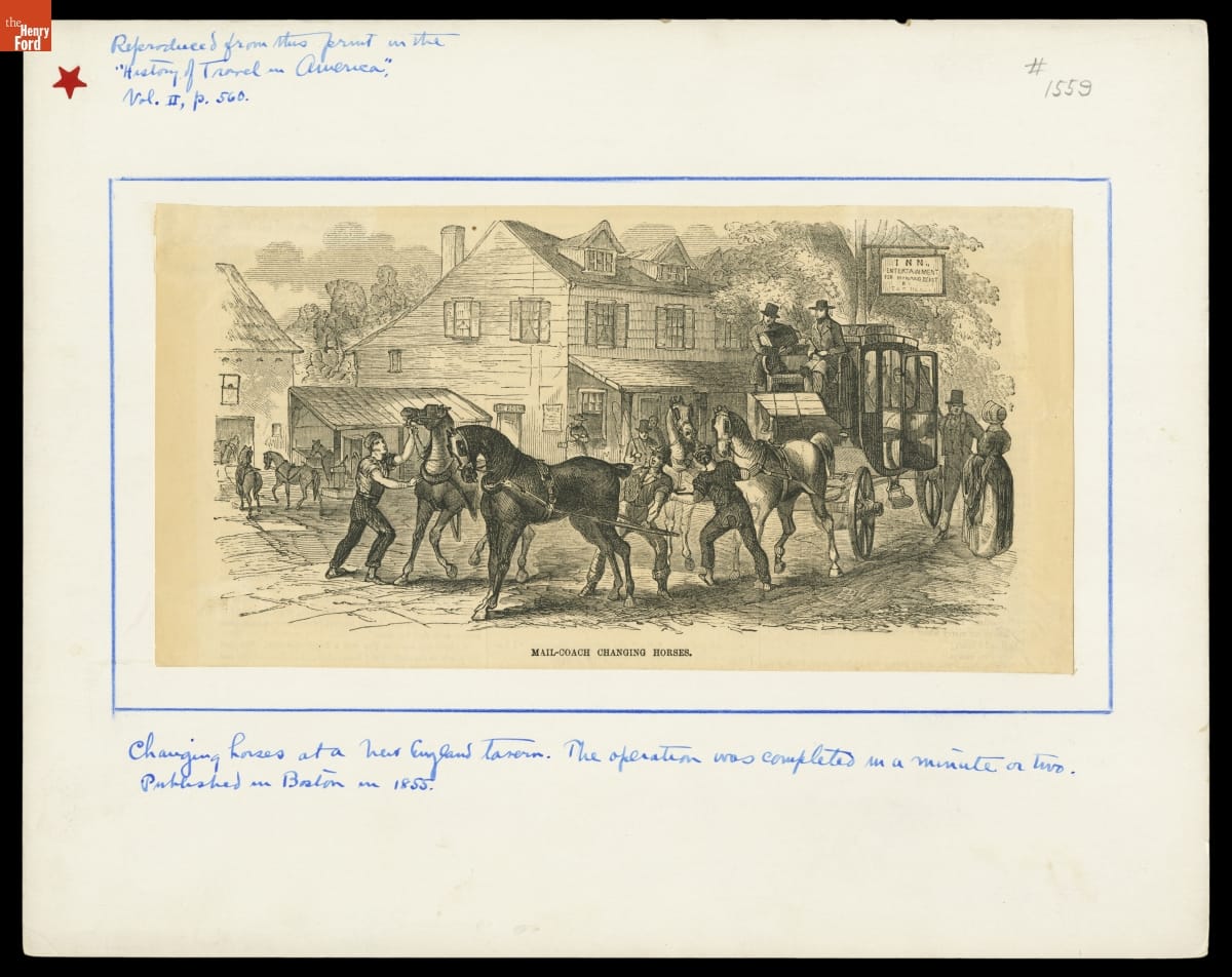 This wood engraving depicts a typical mid-19th-century travel scene. Traveling by stagecoach meant being jostled on rough country roads and stopping every few hours to change horses. Travelers squeezed into coaches and roadside inns with strangers.