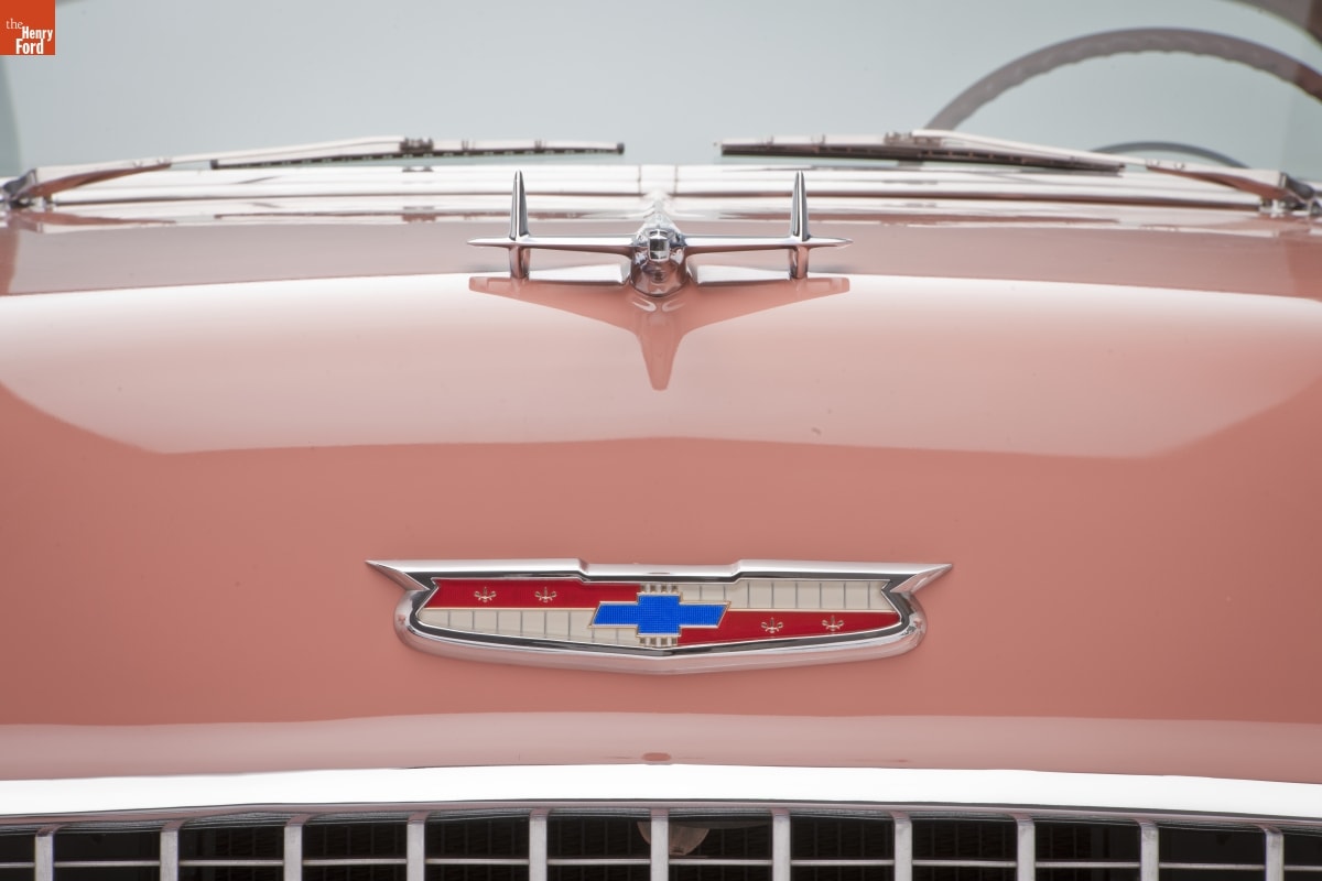 Chevrolet turned its image around in 1955. Its new V-8 engine was light modern, powerful and reliable. Combined with a clean, classic new body style it changed customers' impression of Chevrolet from stodgy and conservative to sporty and youthful almost overnight. This car, in fashionable coral and smoke grey colors, epitomizes Chevy's new slogan, "The Hot One."