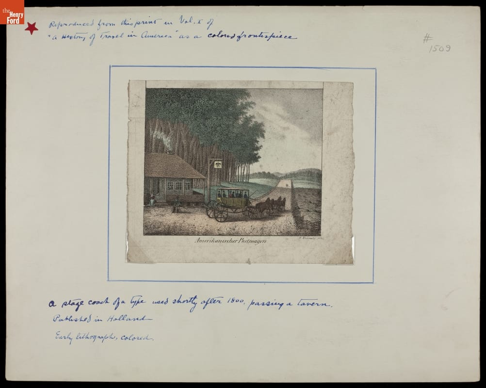 Description beneath: A stage coach of a type used shortly after 1800, passing a tavern./ Published in Holland./ Early lithograph, colored. Written above print: Reproduced from this print in Vol. I of "A History of Travel in America", as a colored frontispiece.