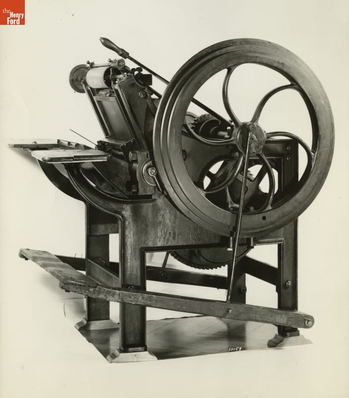The job press was used for short runs of small items like business cards, handbills, and small books. Its foot-operated treadle made printing efficient--typical operators could produce 1000 prints per hour. This job press could also be adapted to run on steam power, allowing the print process to become mechanized for even greater output.