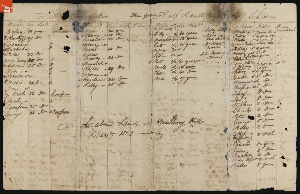 on front, at bottom: The above are at White Hall / Dec 1823 / Among the negros [sic] claimed by [illegible] the following are [illegible] with my [illegible] on back, at top: List [illegible] workers [illegible] Half Hands [illegible] Children below the list, centered: All the above hands at Mulbury [sic] Hill / Dec 1823