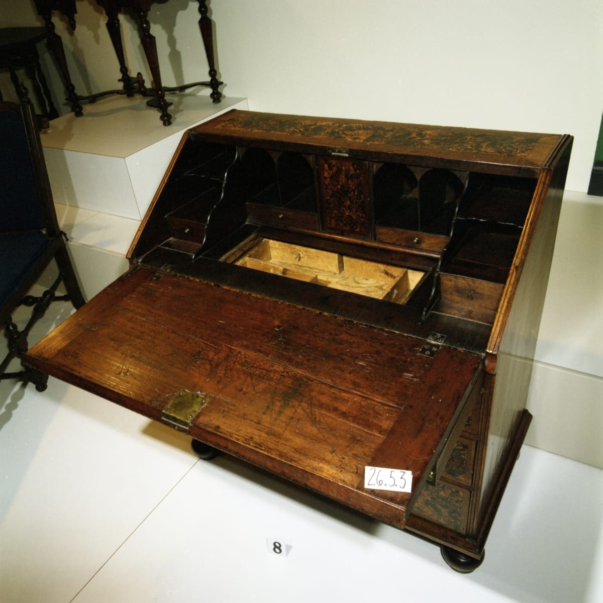 In the early 1700s, prosperous, yet frugal New England merchants showed off their wealth and good taste through functional objects, like furniture. This desk served as place to store important documents and valuables. It has numerous lockable drawers and several secret compartments. The fashionable and expensive walnut burl veneers make this object suitable for display in a parlor, where guests would be impressed.