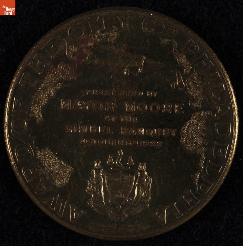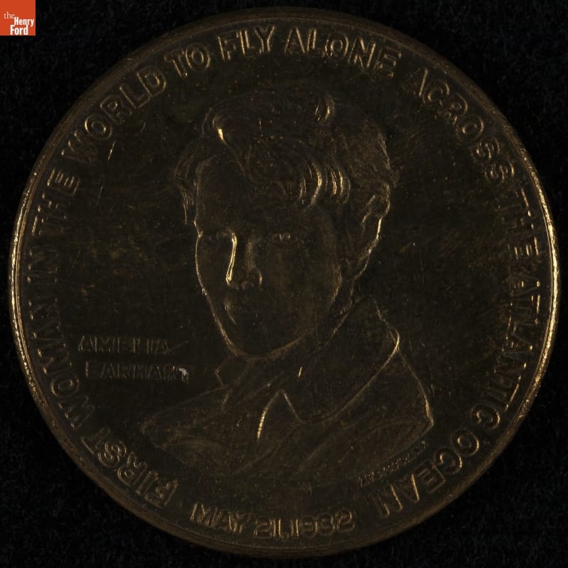 on front: FIRST WOMAN IN THE WORLD TO FLY ALONE ACROSS THE ATLANTIC OCEAN / AMELIA / EARHART / MAY 21, 1932 on back: AWARD OF THE CITY OF PHILADELPHIA / PRESENTED BY MAYOR MOORE / AT THE / GIMBEL BANQUET / OCTOBER 5TH, 1932