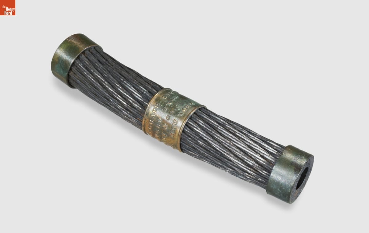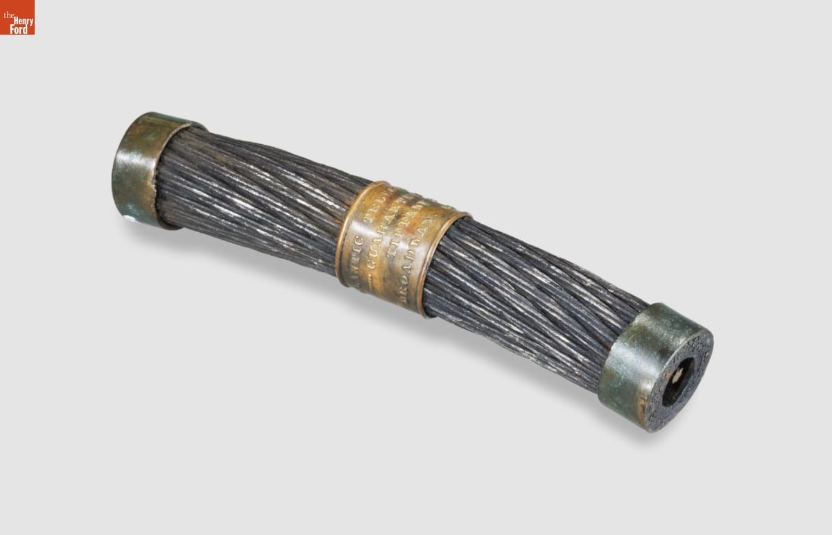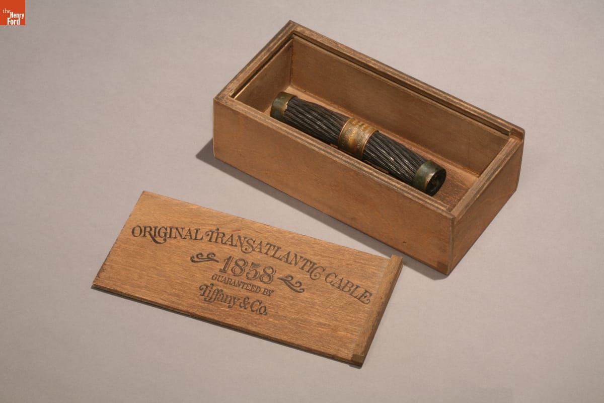 Telegraphs could be sent wherever wires could be hung in the 1850s, but hardwiring signals between transoceanic continents required a feat of engineering. In 1858, a team laid underwater cable across the Atlantic and sent a successful telegram. Though the cable soon failed, pieces were sold as souvenirs in Charles Tiffany's renowned jewelry store as symbols of speed and progress.