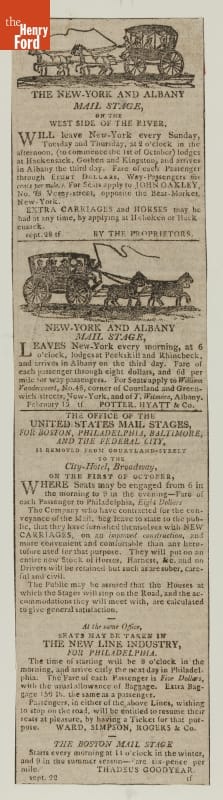 Text reads in part: THE NEW-YORK AND ALBANY / MAIL STAGE, / ON THE / WEST SIDE OF THE RIVER, / WILL leave New -York every Sunday, / Tuesday and Thursday, at 2 o'clock...THE OFFICE OF THE / UNITED STATES MAIL STAGES, / FOR BOSTON, PHILADELPHIA, BALTIMORE, / AND THE FEDERAL CITY, / IS REMOVED FROM COURTLAND-STREET / TO THE / City-Hotel, Broadway, /...WHERE Seats may be engage from 6 in / the morning to 9 / in the evening--Fare of each Passenger to Philadelphia, Eight Dollars... / THADEUS GOODYEAR