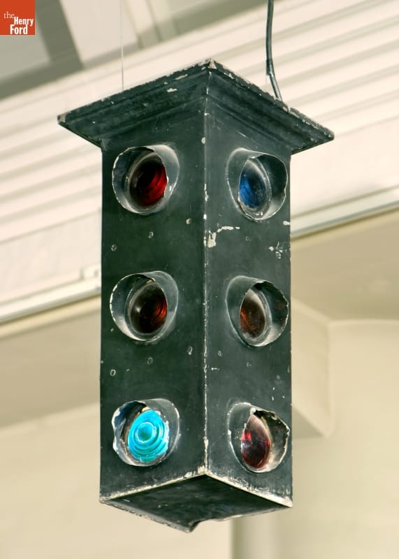 Detroit traffic officer William Potts created this three-color, four-way traffic signal in 1920. Previous illuminated signals used only red and green lights. The addition of an amber "caution" light made driving safer and the three-color signal became the standard by the mid-1930s. This first traffic light was installed at Woodward Avenue and Fort Street in Detroit, Michigan.