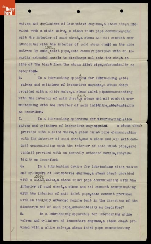 Canadian-American inventor Elijah McCoy developed a mechanical lubricator to oil the slide valves on a steam locomotive. McCoy's device automatically supplied measured amounts of oil to the valve, reducing the need for crews to lubricate it manually. McCoy received a patent on his invention in 1872. He refined the device many times. This patent is for an 1887 modification.
