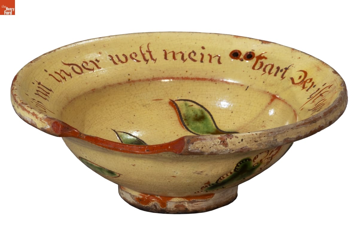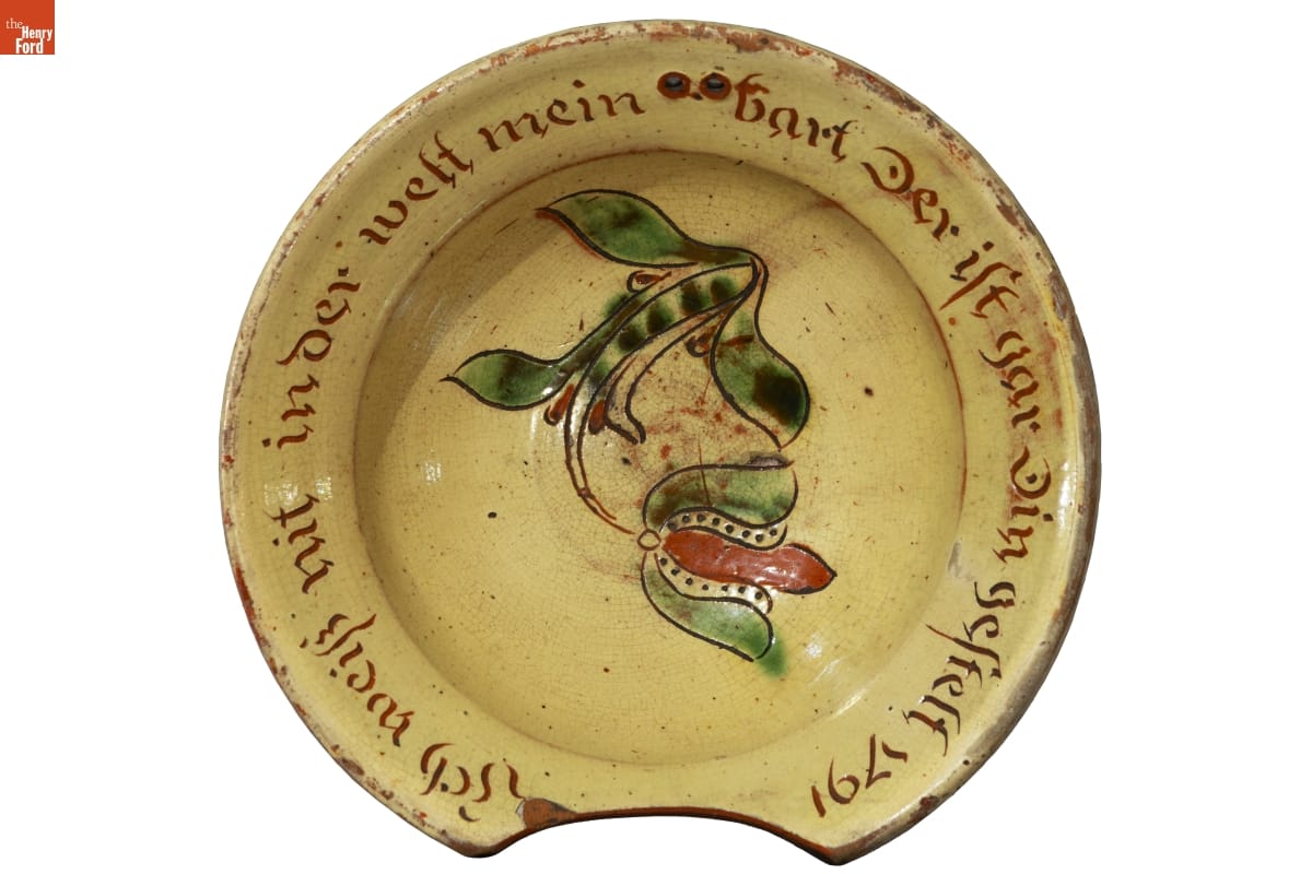 This barber basin is an important early example of Pennsylvania German pottery. It features techniques common to the Pennsylvania German style, including sgraffito (a term used to describe incised decoration) and the use of colorful red slip.