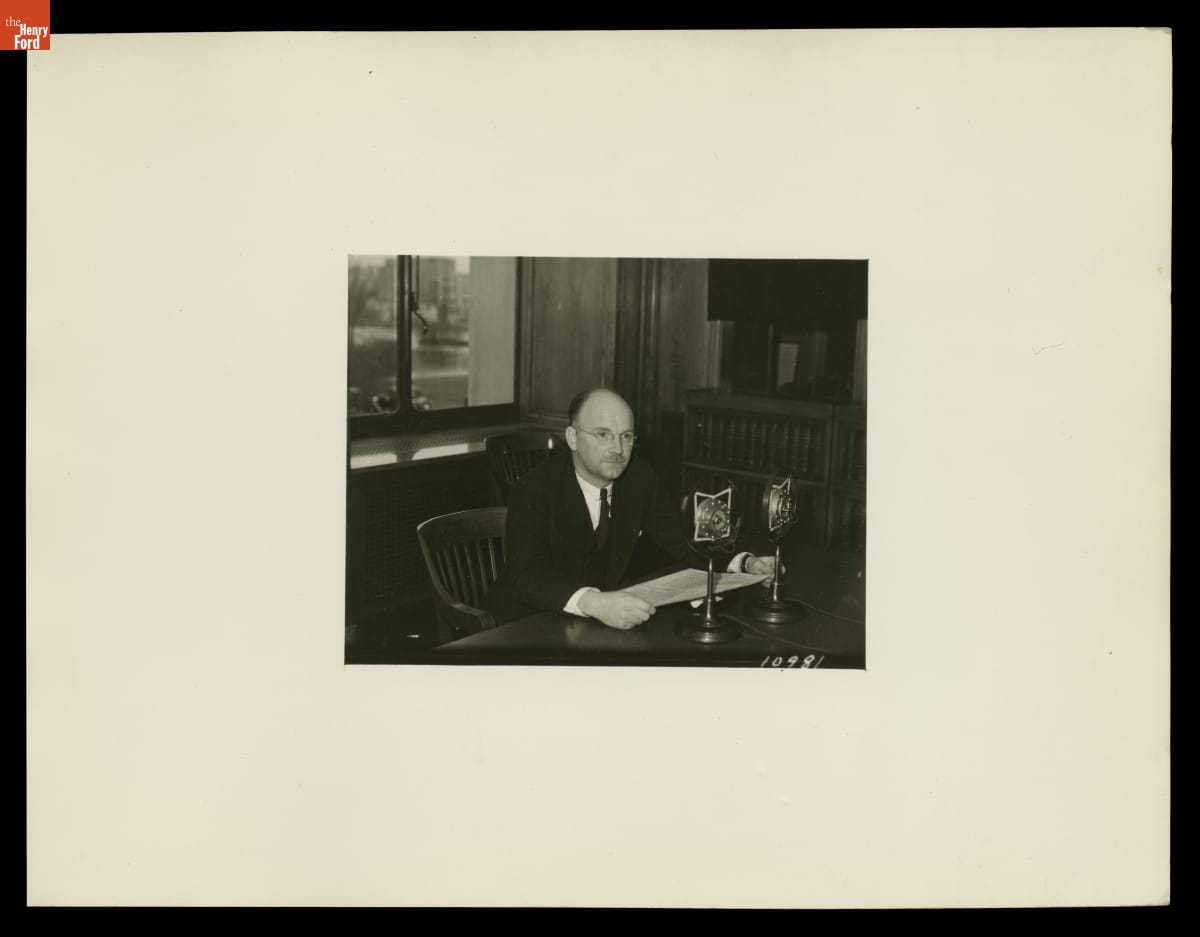Ford Motor Company Engineer Larry Sheldrick Making a Radio Broadcast, December 19, 1933