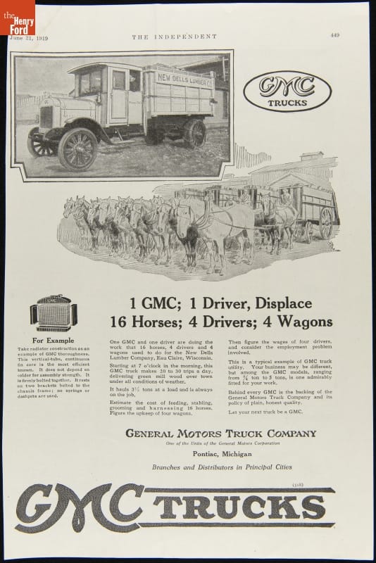 1919 General Motors Truck Company Advertisement, "1 GMC; 1 Driver, Displace 16 Horses; 4 Drivers; 4 Wagons"