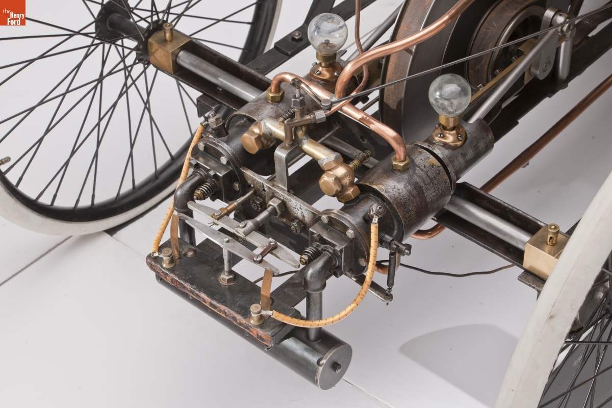 The Quadricycle was Henry Ford's first attempt at building a gasoline-powered automobile. It is as simple as Ford could make it and utilizes commonly available materials. The frame is made from angle iron, the transmission is a combination of leather belt and chain drive, the seat is from a buggy. The two-cylinder engine is based on a Kane-Pennington design described in the January 9, 1896, issue of American Machinist magazine. The details of the engine were incomplete and Ford had to devise his own ignition system. Originally the engine was air cooled, but it ran too hot and Ford added water jackets to the cylinders. Ford sold the Quadricycle in late 1896 for $200, which he spent on building his second car. In 1904, with Ford Motor Company becoming successful, he bought the little vehicle back for $65. Engine: Kane-Pennington-Ford, inline 2-cylinder, atmospheric intake valves, overhead exhaust valves, 59 cu. in., 4 hp (est.)
