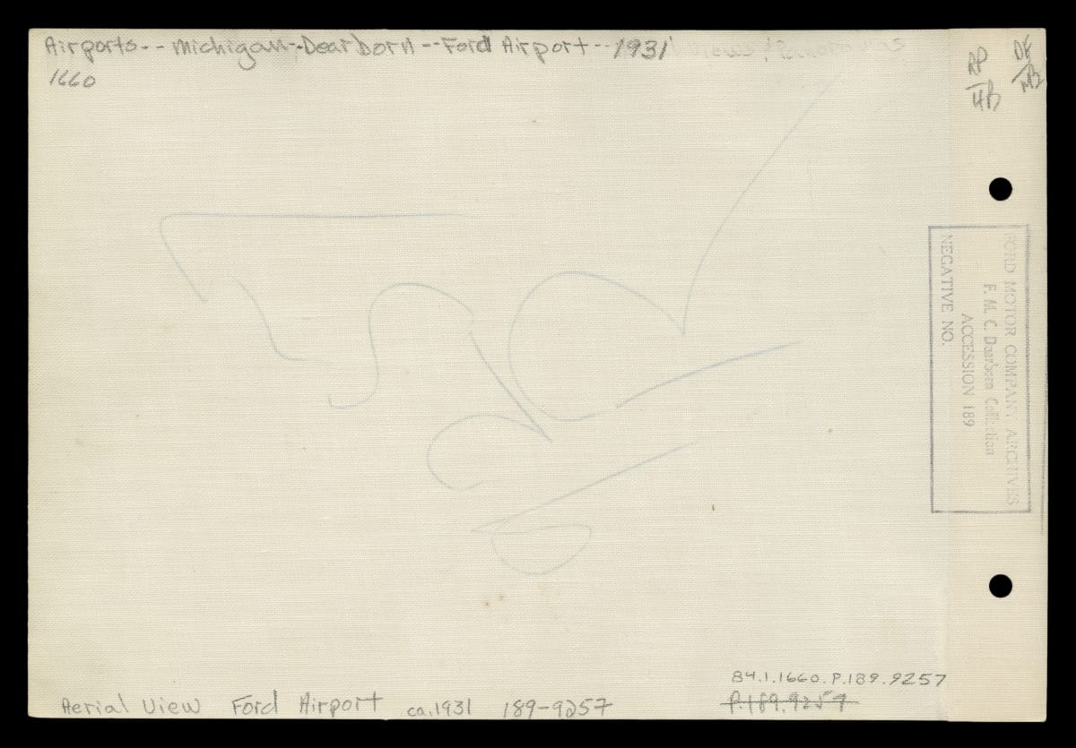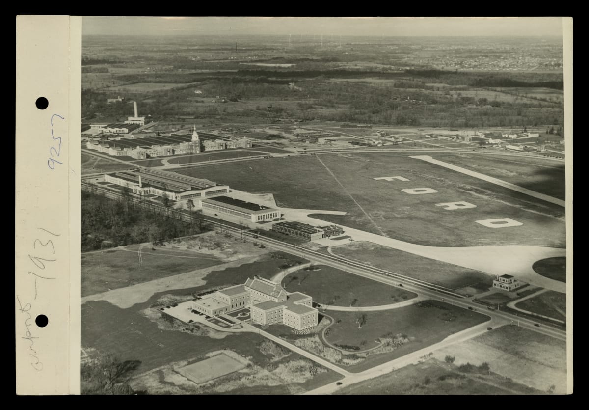 In 1925, an airport opened in Dearborn, Michigan. Edsel and Henry Ford conceived the Dearborn Inn as a business opportunity, a first-class hotel hosting pilots and travelers transiting through the Ford Airport. It is noted as one of the first airport hotels. This aerial photograph shows some of the airfield and the inn (bottom). Also note the Henry Ford Museum's clock tower in the distance.