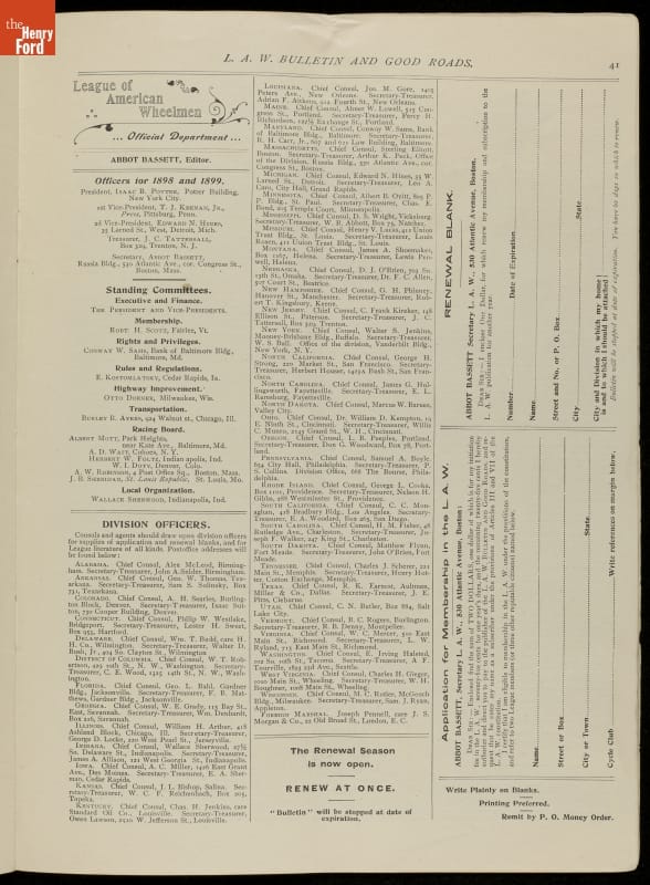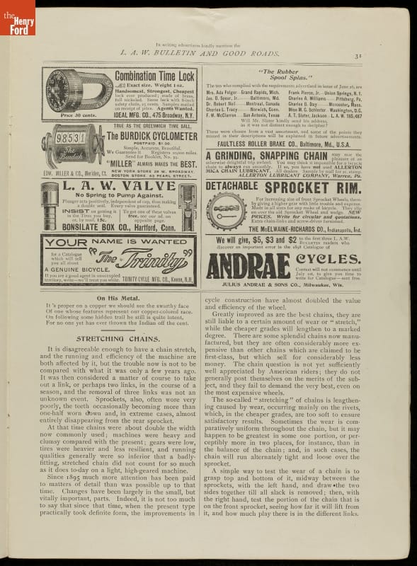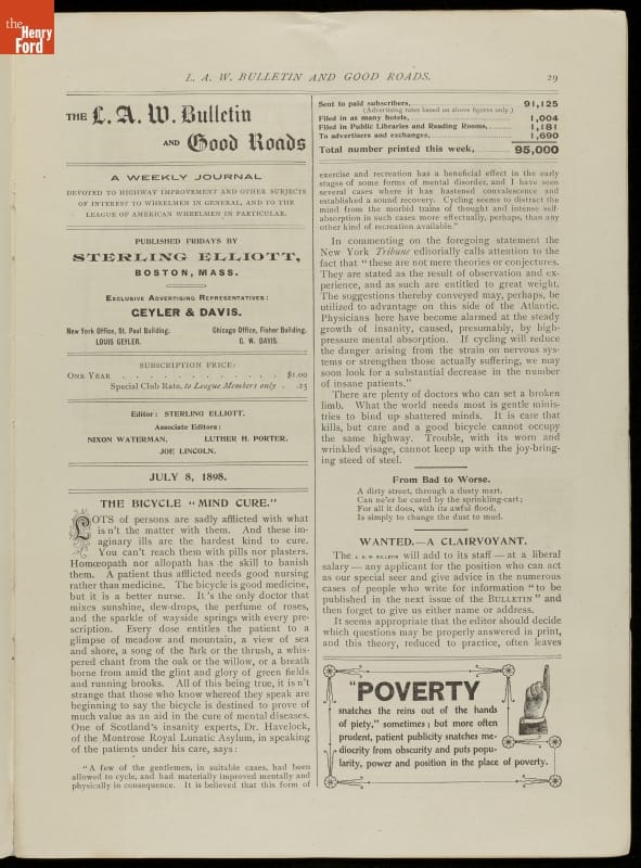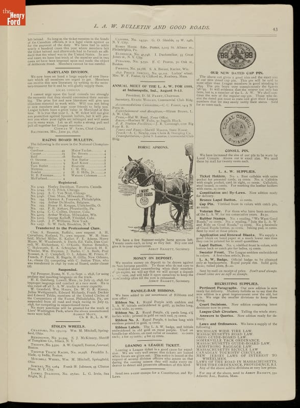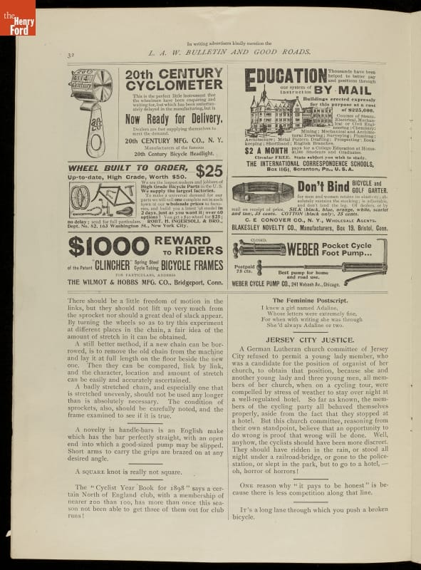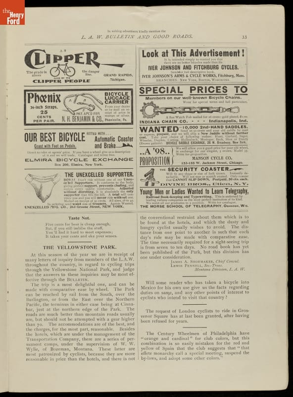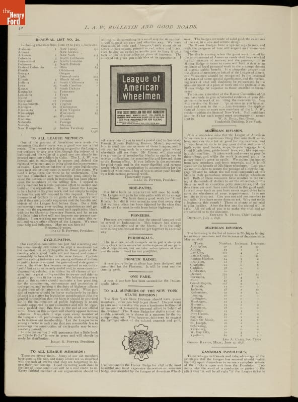 The League of American Wheelmen produced a weekly journal to promote good roads, and to highlight other issues of interest to American cyclists. This typical issue, from July 1898, contained news about the organization and its members. The journal also provided tour and safety information, poems, snapshots, and a host of bicycle advertisements for readers to enjoy.