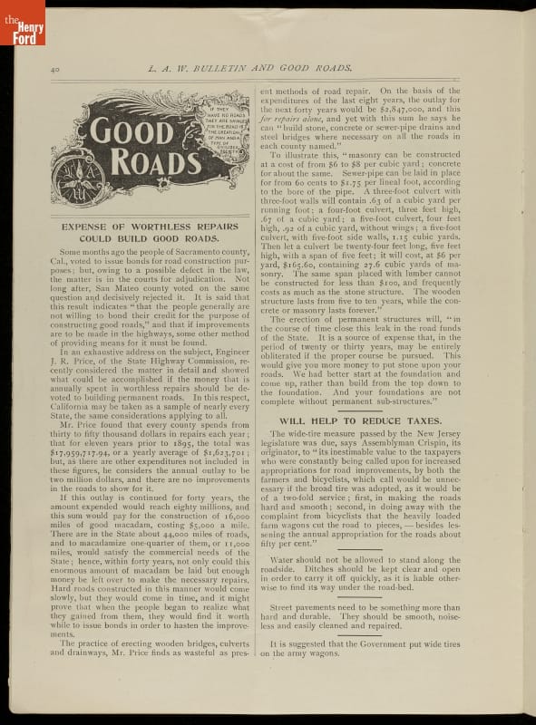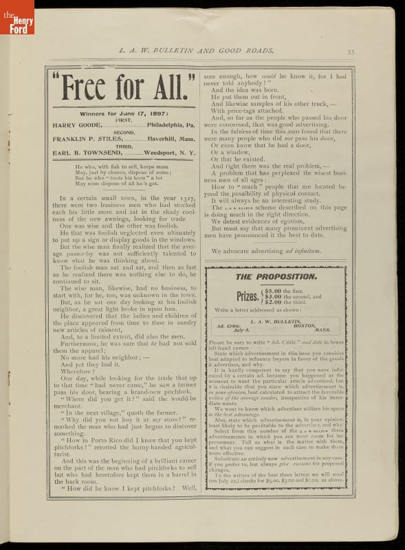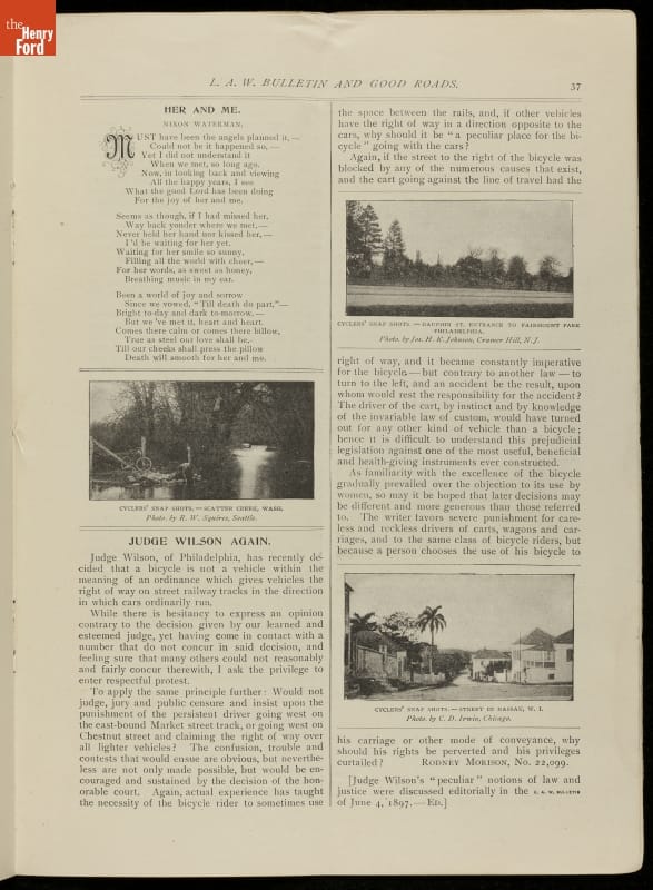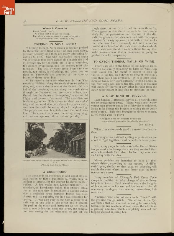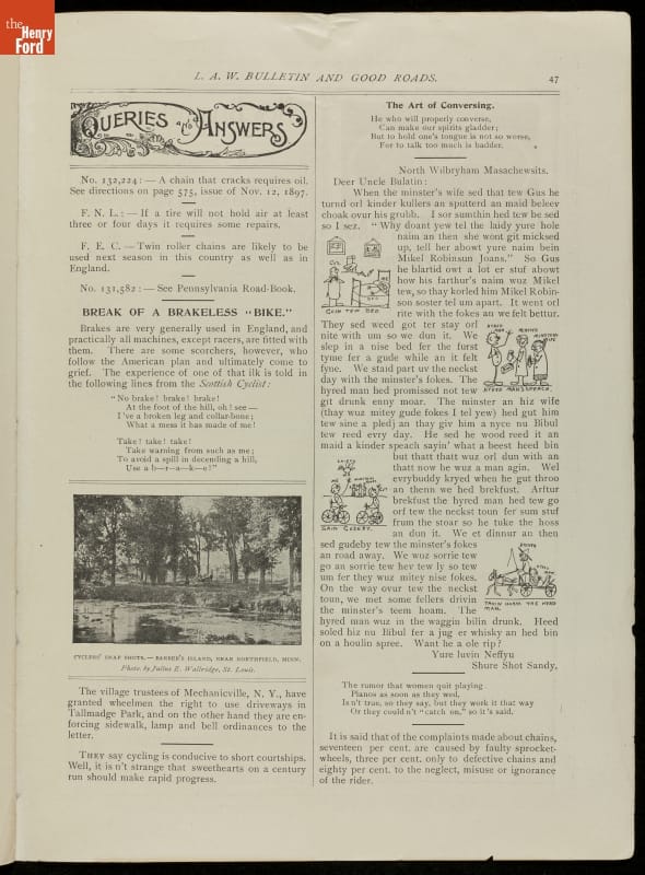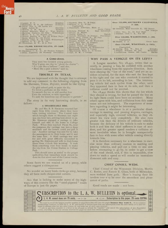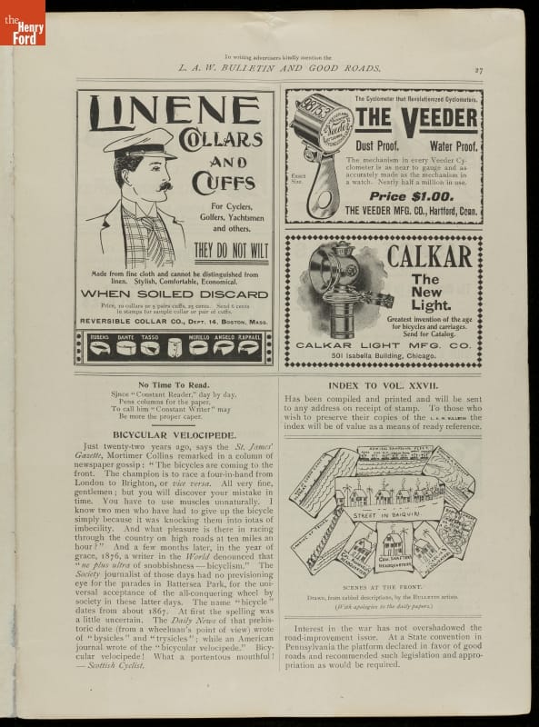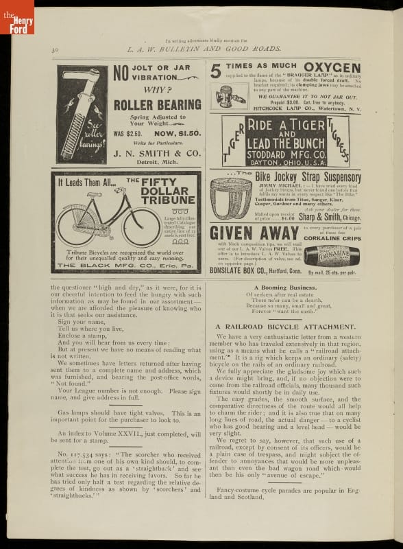 The League of American Wheelmen produced a weekly journal to promote good roads, and to highlight other issues of interest to American cyclists. This typical issue, from July 1898, contained news about the organization and its members. The journal also provided tour and safety information, poems, snapshots, and a host of bicycle advertisements for readers to enjoy.