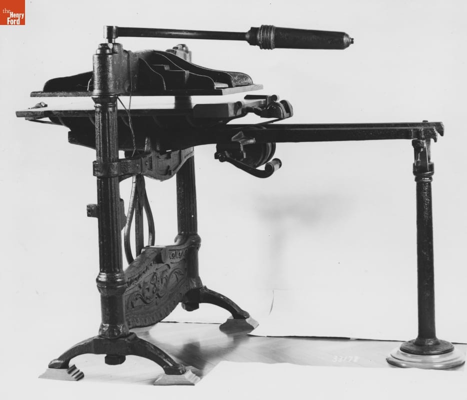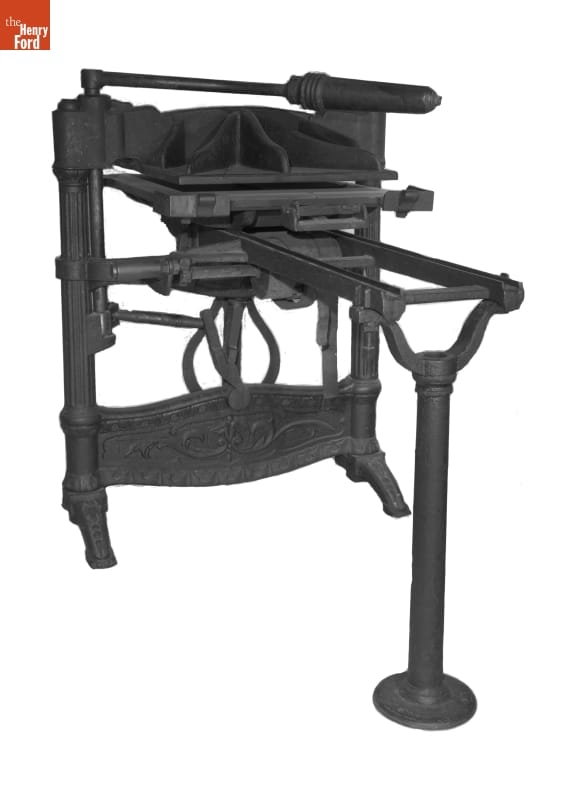 This printing press turned the commonly accepted image of a press upside down. Instead of pressing paper down onto a bed of inked type, a lever pushed the inked type up to the paper. And while it functioned similarly to the widespread Washington press, the dramatic reversal of the Foster press caused printers to be skeptical of its practicality.