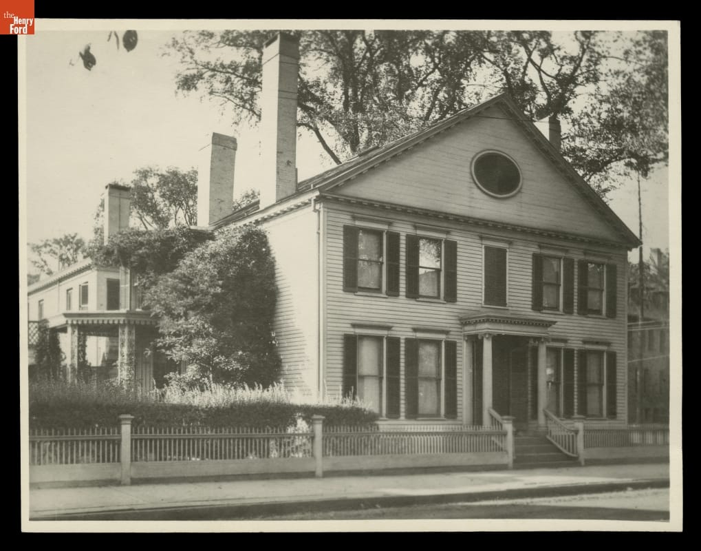 This is textbook pioneer and spelling reformer Noah Webster's home on its original site in New Haven, Connecticut. Henry Ford admired Webster and recognized his house as an important piece of American history. Ford had the building moved to Greenfield Village - his historical outdoor museum in Dearborn, Michigan. This view documents side and rear additions not moved with the house.