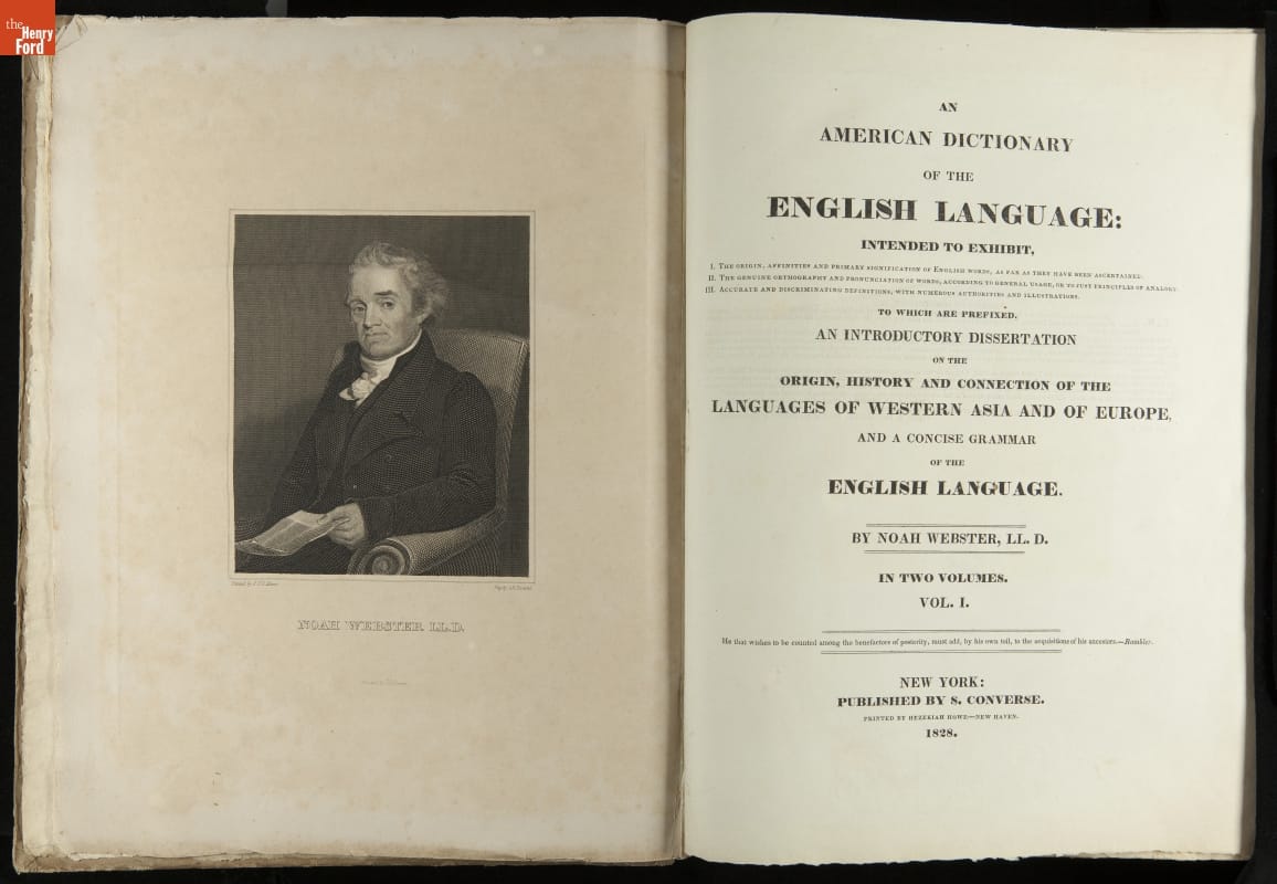 Dictionary by Noah Webster; printed by Hezekiah Howe, New Haven, Connecticut; published by S. Converse, New York, New York. Frontispiece engraved by A. B. Durand after a portrait by Samuel Morse; printed by J. R. Burton.
