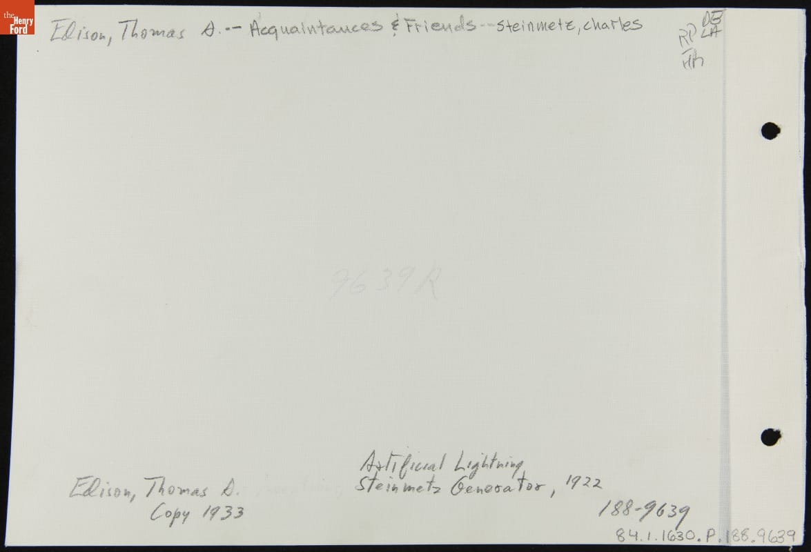 Charles Steinmetz's electrochemical and high-voltage research at General Electric attracted public attention. The press portrayed Steinmetz as a scientific "wizard" and sensationalized his technical work for popular audiences. During a highly publicized visit in 1922, Thomas Edison observed a lightning generator Steinmetz developed to test new electrical equipment. Newspapers hailed Steinmetz as a "modern Jove," creator of artificial lightning.