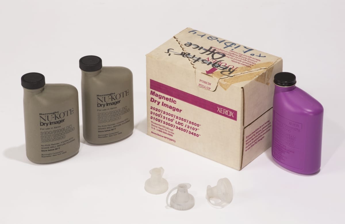 The Xerox 914 was the first commercially successful automatic office copier. Using Chester Carlson's xerography process, documents were produced electrostatically, using powdered toner. This copier weighed 650 pounds and made one copy every 26 seconds on paper up to 9 x 14 inches. The 914 also came with a "scorch eliminator" -- a small fire extinguisher for taming fires caused by overheating.