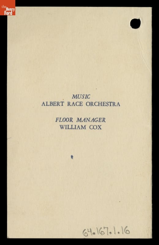 Young people living in the vicinity of the Martindale House, a hotel run by George Martindale in rural Greenfield Township, Wayne County, Michigan, gathered in the hotel's large ballroom to enjoy dancing to quadrilles, reels, and schottisches. Albert Race played the dulcimer, as he called off the dance steps. This dance card is from the night Henry Ford met his wife, Clara Bryant.