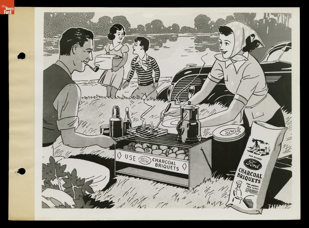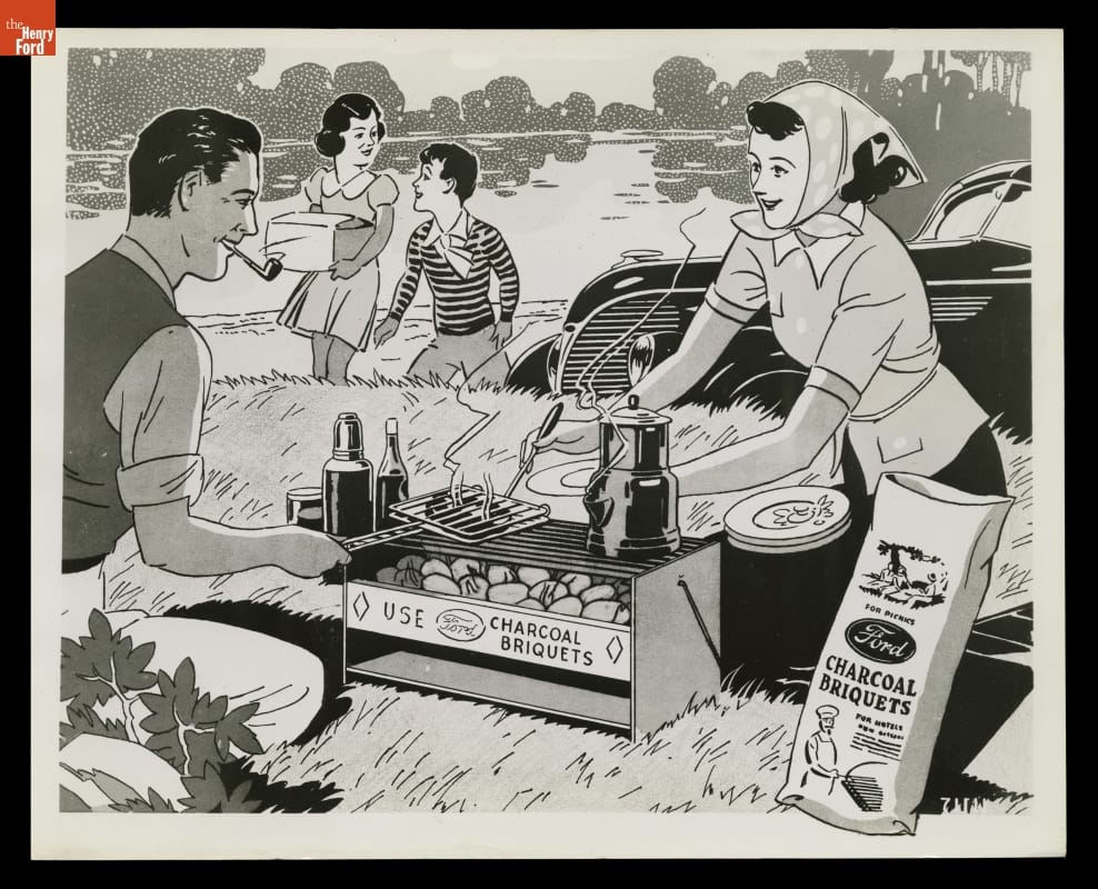 Ford Motor Company sawmills created heaps of wood wastes. Some was used to produce steam for factory operations. The rest was carbonized and compressed into charcoal. Workers mixed charred hardwood chips with starch, forming nearly 100 tons of charcoal briquettes each day. Dealers sold branded bags of the popular briquettes in Ford dealerships across the country.