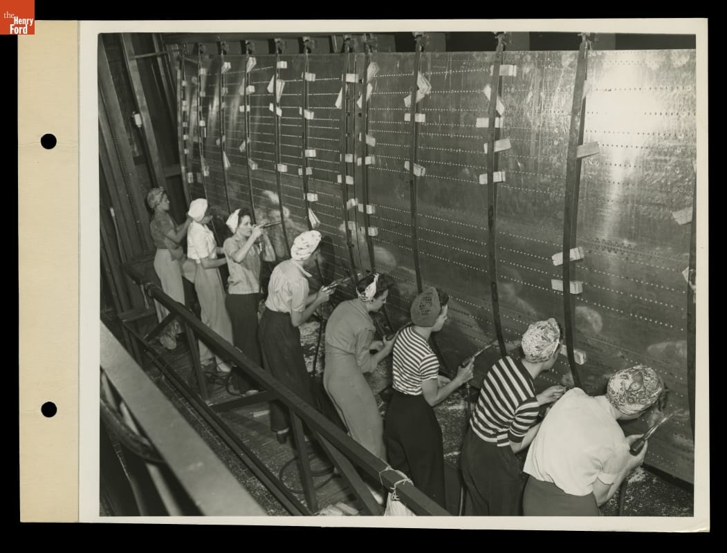 Women represented approximately one-third of the workers at Ford Motor Company's Willow Run plant, where they did everything from clerical work in the offices to riveting and welding on the assembly line. During World War II, women joined the workforce in record numbers to take on essential jobs traditionally held by men who had joined the armed forces.