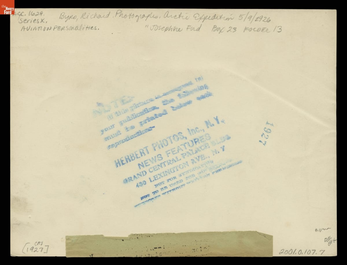 attached piece of paper at bottom in part: BYRD SCANS THE SKIES. ...SHOWN WITH A SEXTANT THAT HE USED ON HIS FLIGHT IN THE ARCTIC, AND WHICH HE WILL USE ON HIS ATTEMPTED FLIGHT FROM NEW YORK TO PARIS.. etc. ink stamp on back: ...HERBERT PHOTOS, Inc. N.Y. NEWS FEATURES... NOT FOR SYNDICATION ... other ink stamp on back: 1927