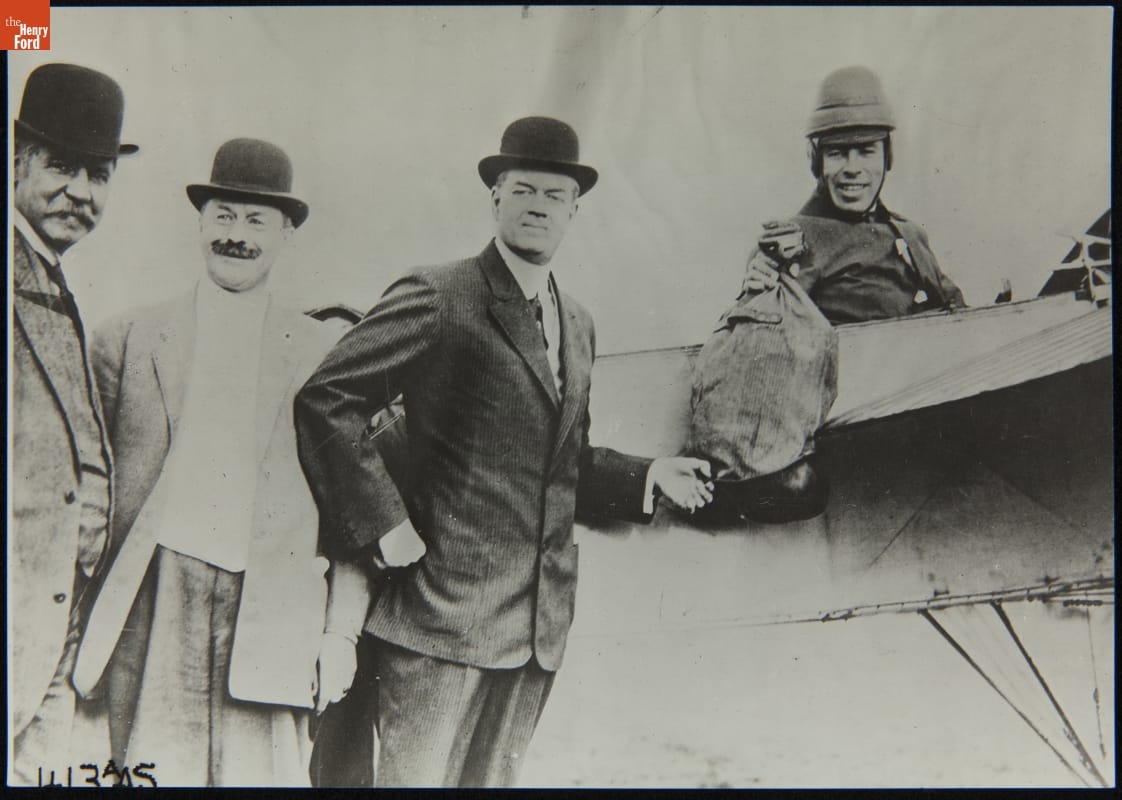 U.S. Postmaster General Frank Hitchcock Poses with Earle Ovington and the Bag Used to Carry the First U.S. Air Mail, September 1911