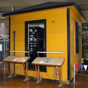 Early pilots depended on landmarks, preventing reliable navigation in bad weather. Henry Ford's engineers developed a radio beacon that simultaneously transmitted two Morse code letters, allowing pilots to steer until the separate signals merged into a steady hum. The original beacon station at Ford Airport (shown here) was removed in 1933 and is now on display inside the museum.