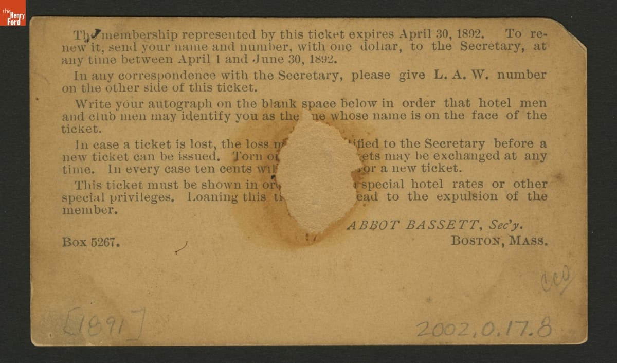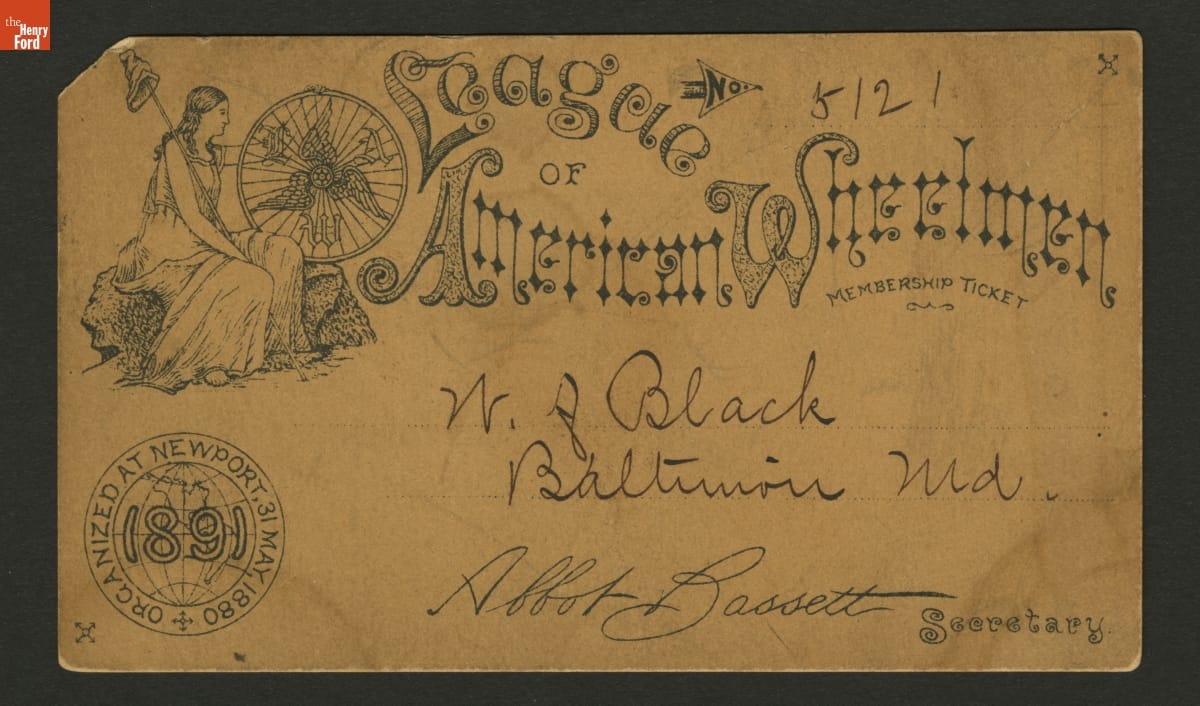 Printed on card from top down: League / of / American Wheelmen / MEMBERSHIP TICKET / Handwritten in ink: 5121 / W. J. Black / Baltimore Md. / Albert Bassett / Printed paragaraph on reverse side reads in part: ... expires April 30, 1892. To renew it, send your name and number with one dollar, to the secretary, at any time between April 1 and June 30, 1892...