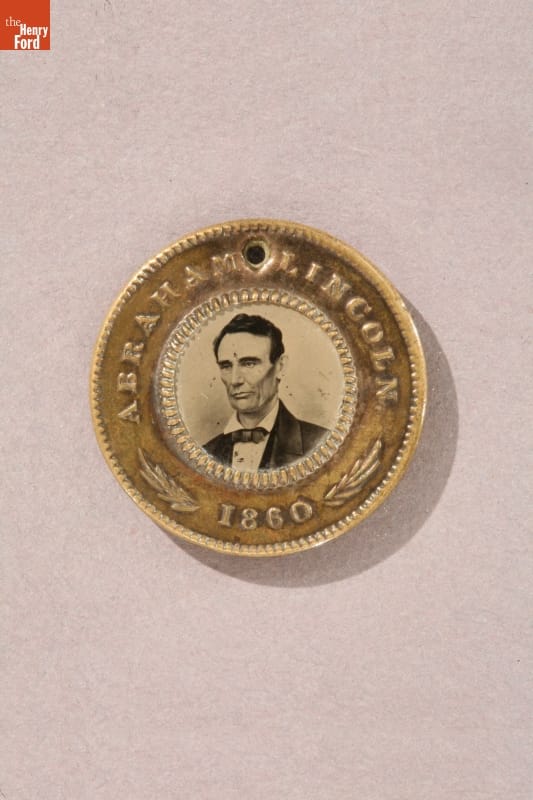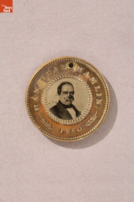 Abraham Lincoln and Hannibal Hamlin campaign button for the 1860 presidential election containing tintype portraits of the Republican Party candidates on each side. This use of photography in political campaigns was still unusual at the time--most campaign buttons did not include photographic images of the candidates.