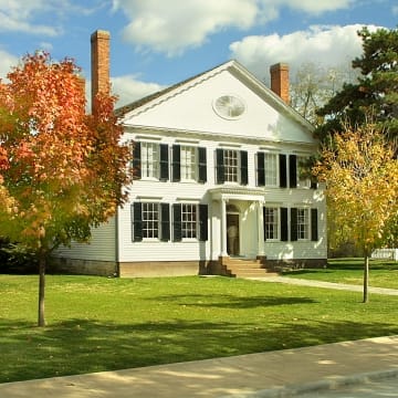 Noah and Rebecca Webster built their comfortable home in a fashionable middle-class neighborhood of New Haven, Connecticut, during the early 1820s. They lived only a few blocks from New Haven's town green and very near Yale College. The house, shown here (far right) about 1927, was situated close to the street, as were most urban homes of the early 19th century.