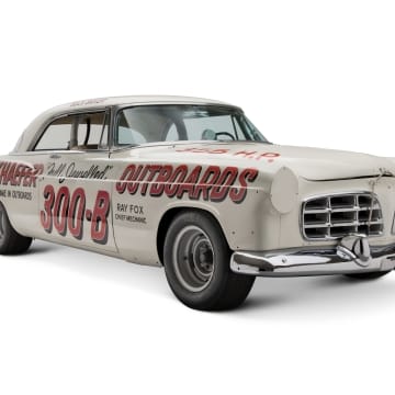 Carl Kiekhaefer's team dominated NASCAR in 1955 and 1956. The car that won this trophy was driven by 1956 NASCAR national champion Buck Baker. Kiekhaefer, who founded boat engine builder Mercury Marine, was among the first team owners to run a highly professional operation with dynamometer tests for his engines, transporter trailers for his cars, and uniforms for his crew.
