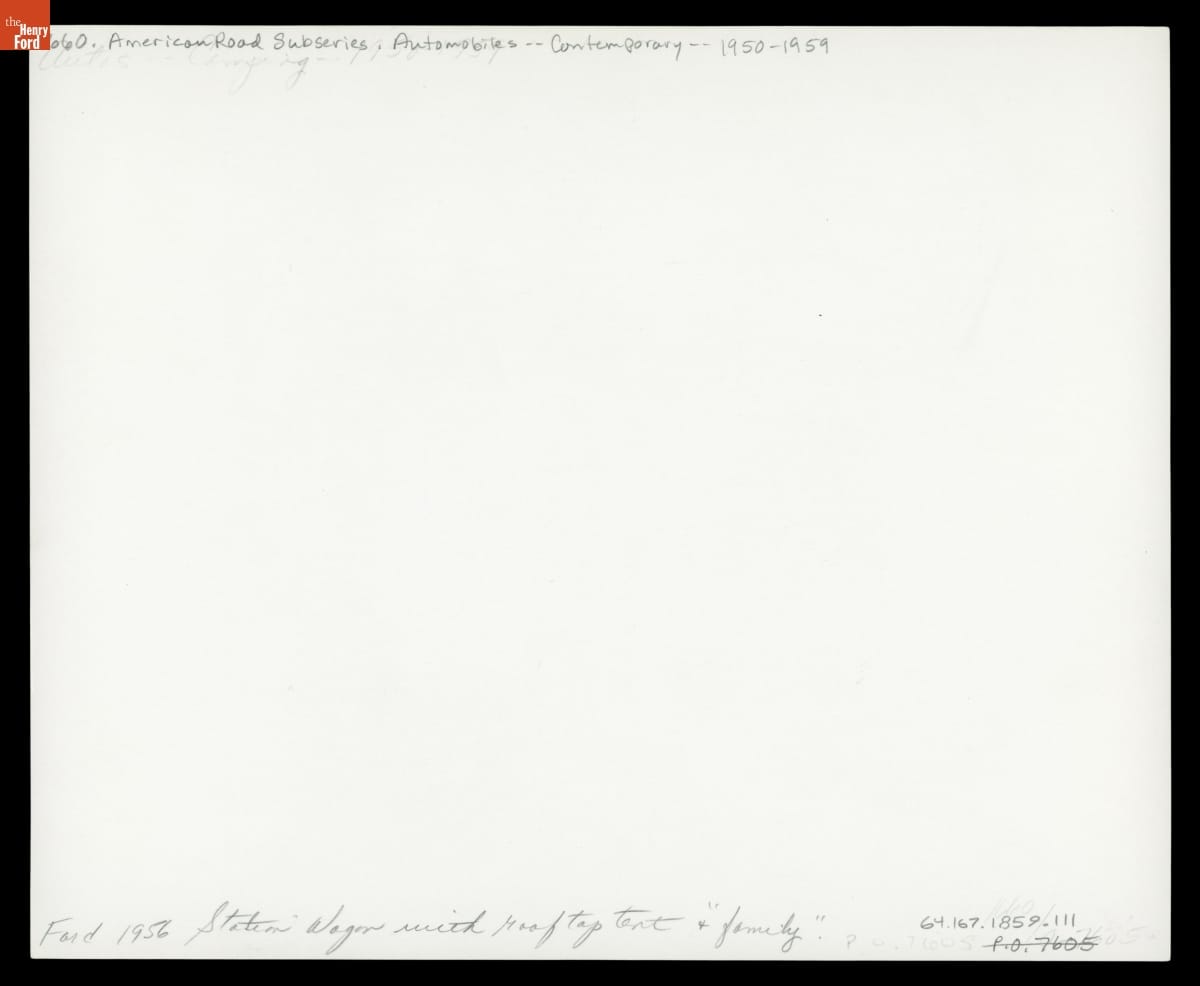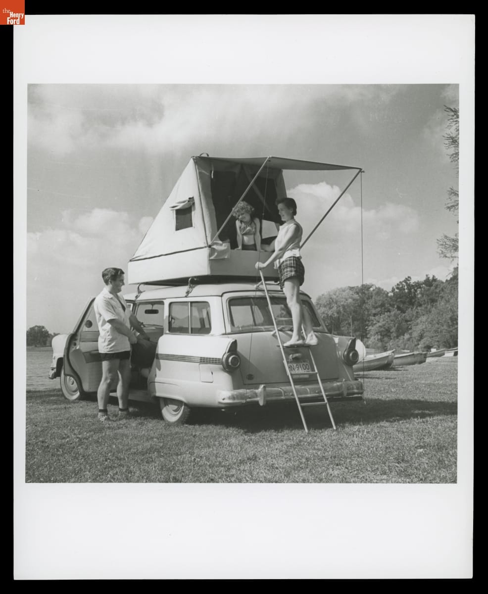 Auto camping took many forms, even attaching your tent to the top of your car. This photograph shows a rooftop tent on a 1956 Ford station wagon.