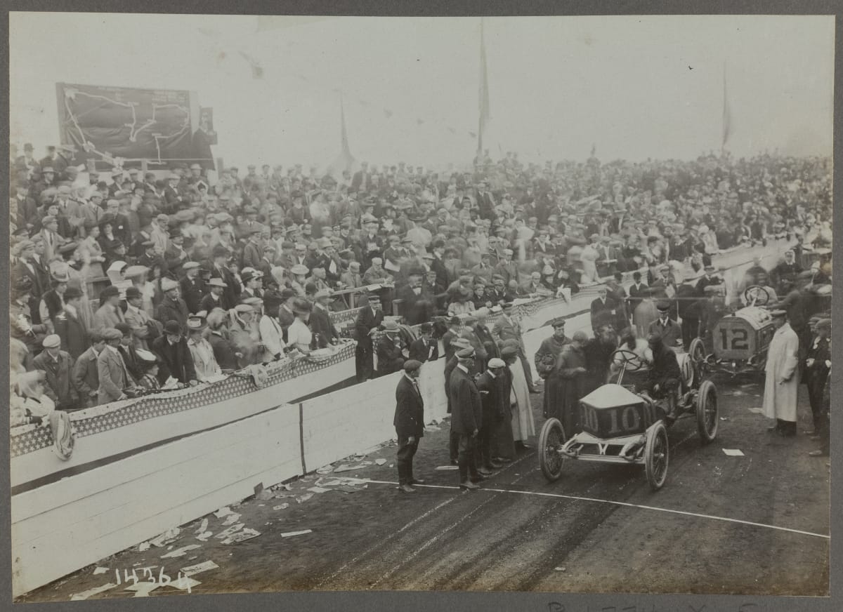 Spectators in the grandstand await the start of the 1906 Vanderbilt Cup race on Long Island, New York. Elsewhere, excited fans were much more difficult to control. Crowds flooded the course during the cup race, and one spectator was killed. The Vanderbilt Cup road race was suspended for 1907.