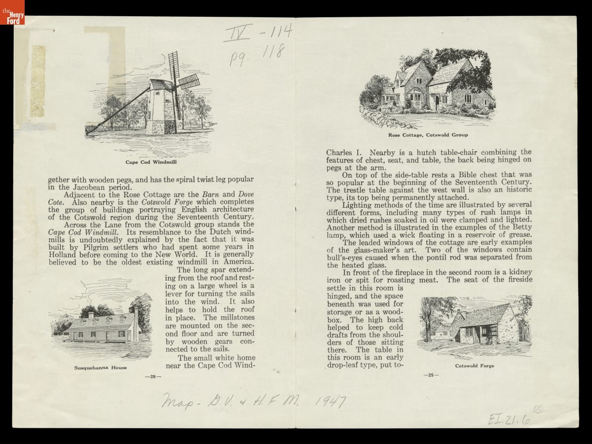 By 1947, Henry Ford had assembled a collection of nearly 90 historic and reproduction buildings in Greenfield Village. Ford had established the Edison Institute as a teaching institution in 1929, but relented to public demand and began admitting visitors in 1933. This map shows some efforts to accommodate increasing attendance figures, including a gatehouse, lunch wagon, and rest rooms.