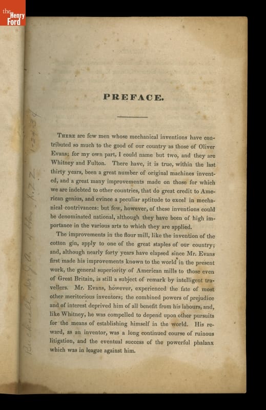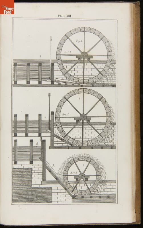 This instructional handbook was originally written and published by Oliver Evans (1755-1819). In the late 1700s, Evans developed a continuous conveyor system for milling flour. The Young Mill-Wright and Miller's Guide explained his labor-saving innovations through text and technical illustrations. Published in fifteen editions between 1795 and 1860, the influential book helped revolutionize the flour-milling industry.