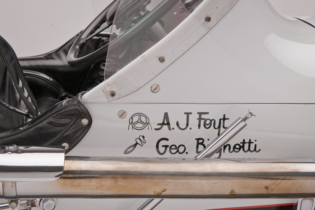 On front nose: 1 On left and right side of hood: BOWES / SEAL / FAST On right side near cockpit: [cartoon of hands on steering wheel] A. J. Foyt / [cartoon of wrench] Geo. Bignotti Decal, on left near cockpit: EQUIPPED / WITH / PERFECT / CIRCLE / PISTON RINGS On back left and right: 1