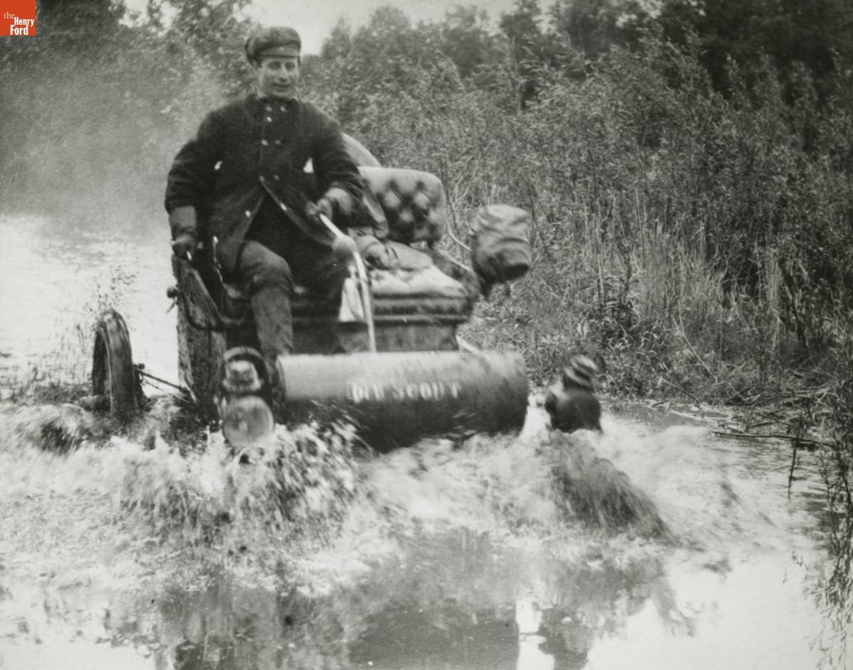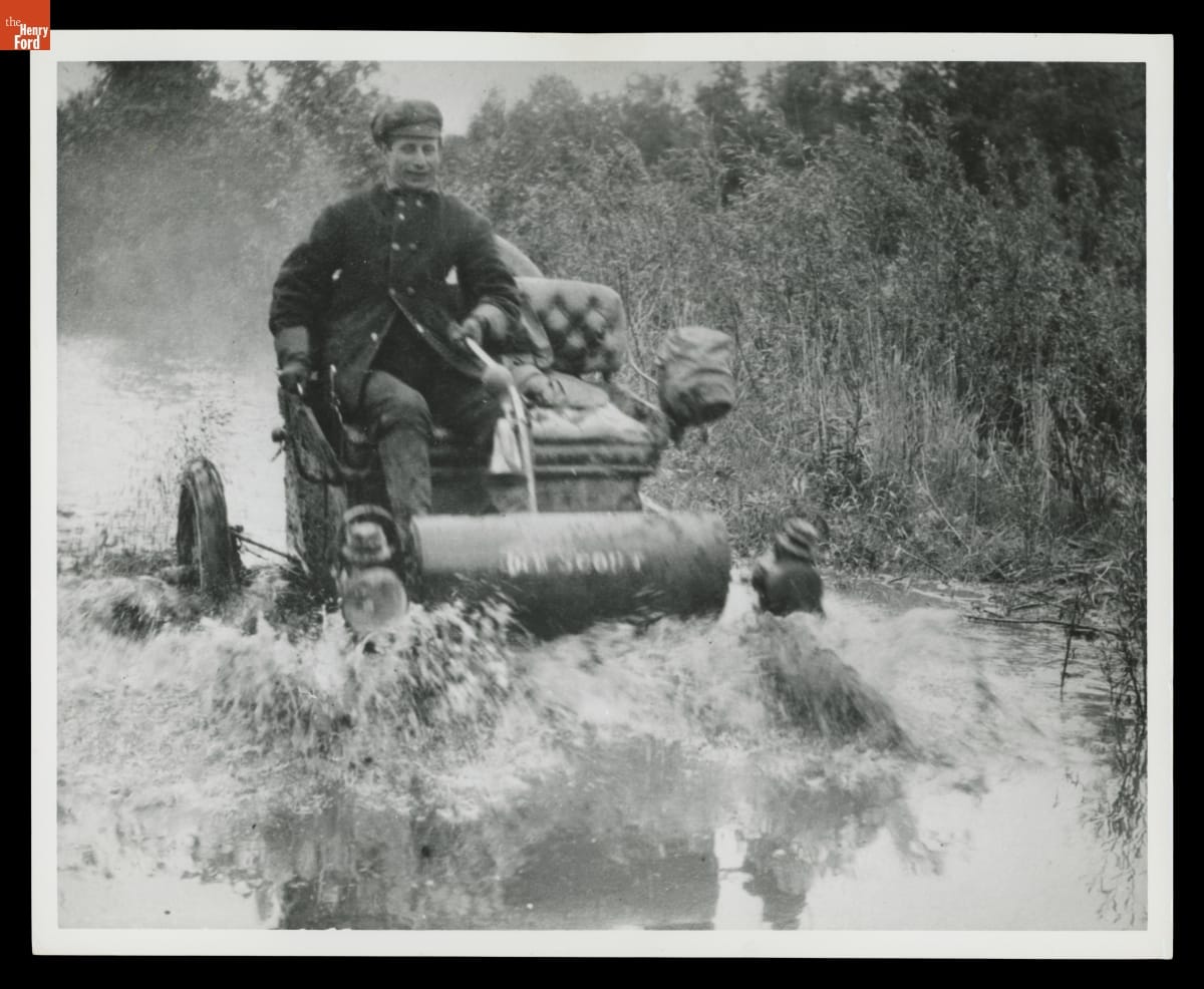 In 1905, two Oldsmobiles competed in an east to west transcontinental race from New York City to Portland, Oregon. In this photograph Dwight B. Huss navigates "Old Scout" through Iowa's flooded Skunk River. Old Scout won the race over his competitor "Old Steady" reaching Portland in forty-four days.