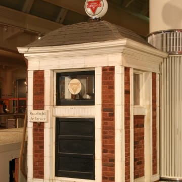 This 1920s photograph shows Samuel Raymond's gasoline station on Main Street in Adrian, Michigan. Drivers stopped along the curb to use this street side station. Gas, oil, and water were available. At times, cars lined the street waiting for service. The station was moved to The Henry Ford in 1930 when the street was widened.