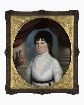 This is Eliza Webster Jones, one of Noah Webster's eight children. Webster was a family man, doting on his children and grandchildren and delighting in their activities. Eliza lived with her parents and the younger Webster siblings in the New Haven, Connecticut, home after it was completed in 1823. She married Henry Jones in 1825, probably about the time this painting was done.