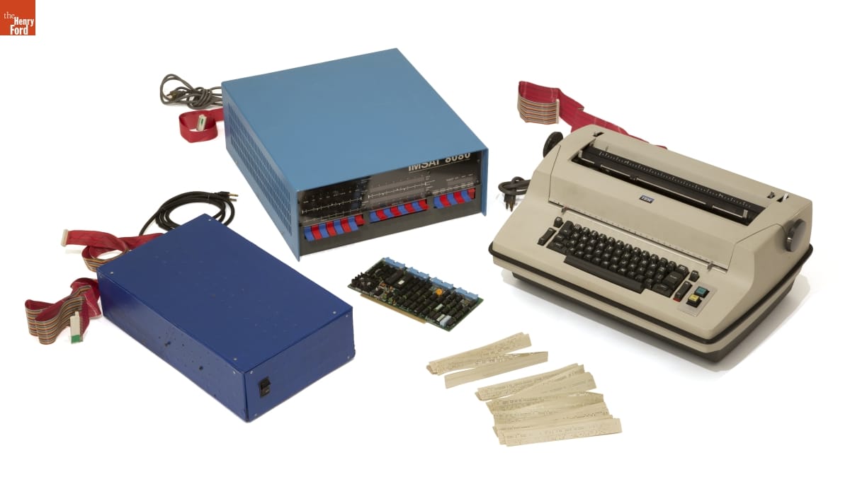 The IMSAI 8080 was a clone of the Altair 8800, the first mass marketed personal computer. It was a popular "kit computer," requiring assembly and programming. With no keyboard, toggle switches allowed input and LED lights signaled output. This could be modified using an IBM I/O typewriter. The donor, O.S. Narayanaswami, was a mechanical engineer interested in the educative power of computers.