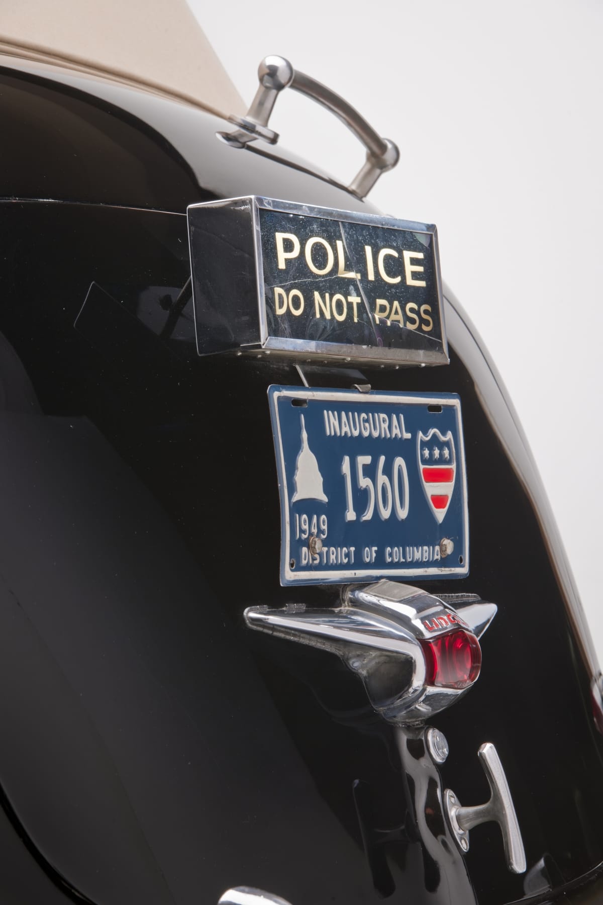 Siren on left front reads: DOUBLE TONE LONG ROLL SIREN/MADE BY FEDERAL ELECTRIC CO. CHICAGO ILL. On Glass sign above license plate: POLICE/DO NOT PASS one hubs: V-12 LINCOLN On Radiator front, in red: LINCOLN / 12