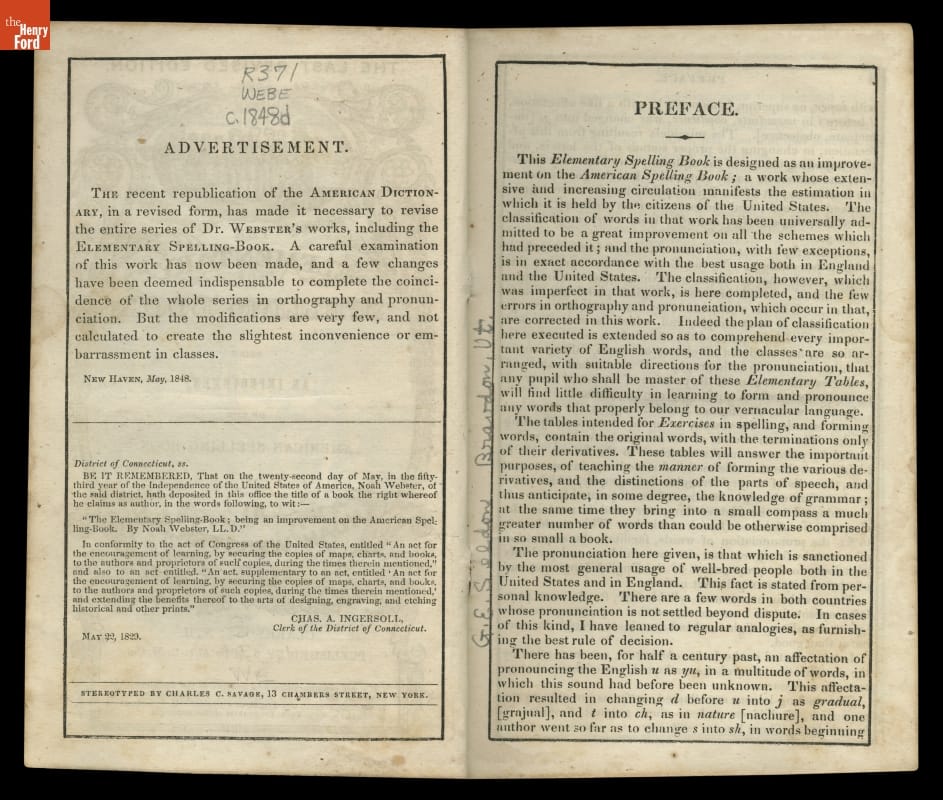 Revision of a book by Noah Webster. Published by S. Ide, Agt. C.M. Co., Claremont, New Hampshire. Stereotyped by Charles C. Savage, 13 Chambers Street, New York.