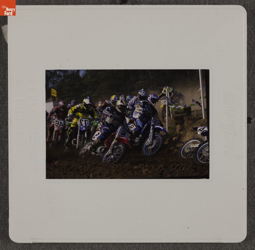Motocross competitions -- off-road motorcycle races on specially built tracks -- have been held since the early 1900s. The Steel City motocross circuit in Delmont, Pennsylvania, near Pittsburgh, hosted its first major event in 1988. This photo was taken there ten years later, when Doug Henry won the 250cc class victory and Robbie Reynard took the 125cc class.