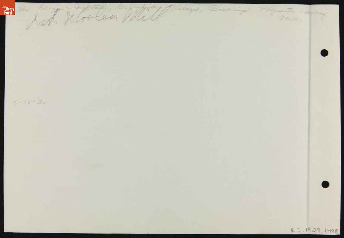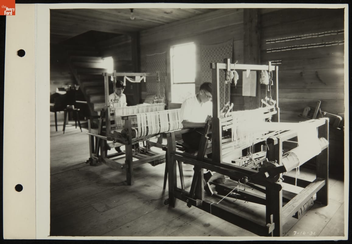 Henry Ford believed in "learning by doing." Students enrolled in the Edison Institute Schools located on the grounds of Ford's Greenfield Village had ample opportunities for practical, hands-on training. Students, if they desired, could learn to weave. Beginners used small tabletop looms. As they progressed students created woven materials using larger looms located in Greenfield Village's Plymouth Carding Mill and Weaving Shed.