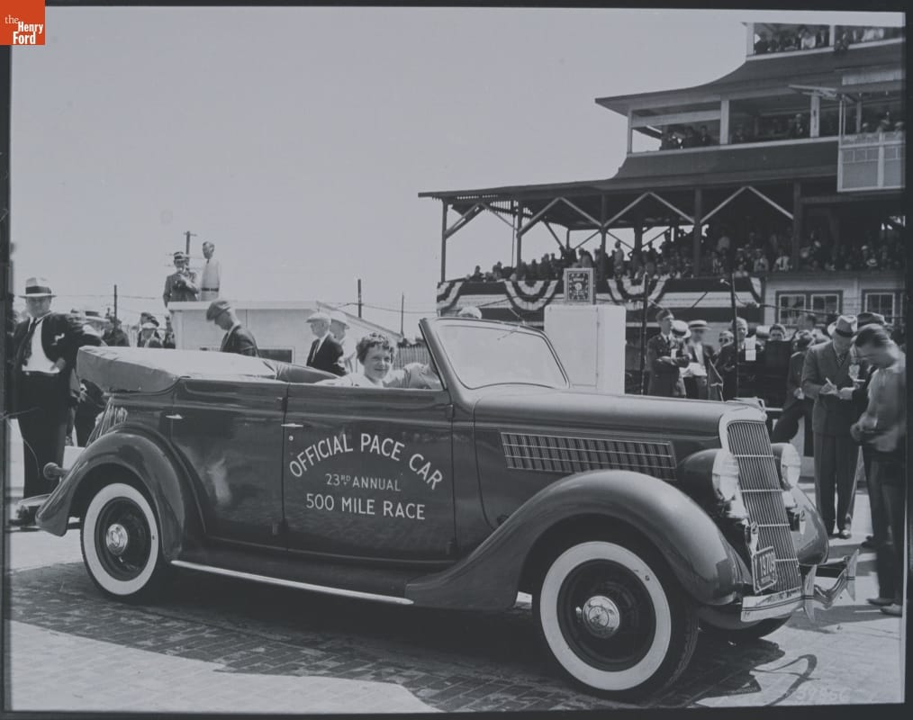 Celebrities are a longstanding tradition at the Indianapolis 500. Actors, musicians, athletes, politicians, and automotive industry leaders all have played various ceremonial roles in the race's festivities. Amelia Earhart served as an honorary referee at the 1935 race. The pace car that year was a Ford Model 48 convertible sedan, driven by Ford executive Harry Mack.